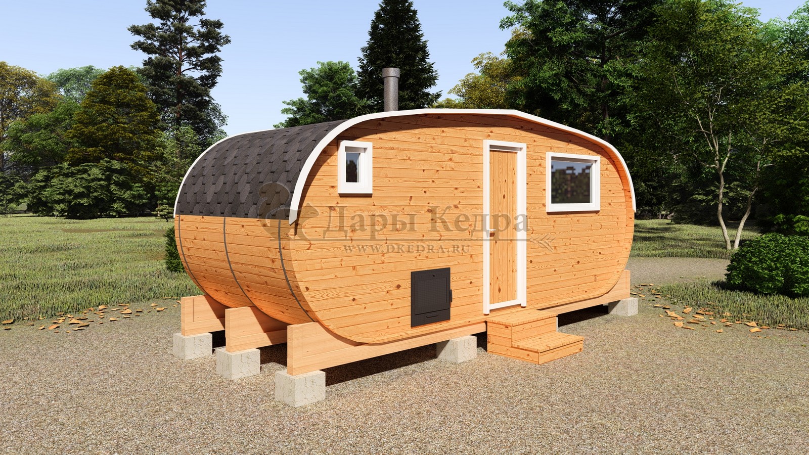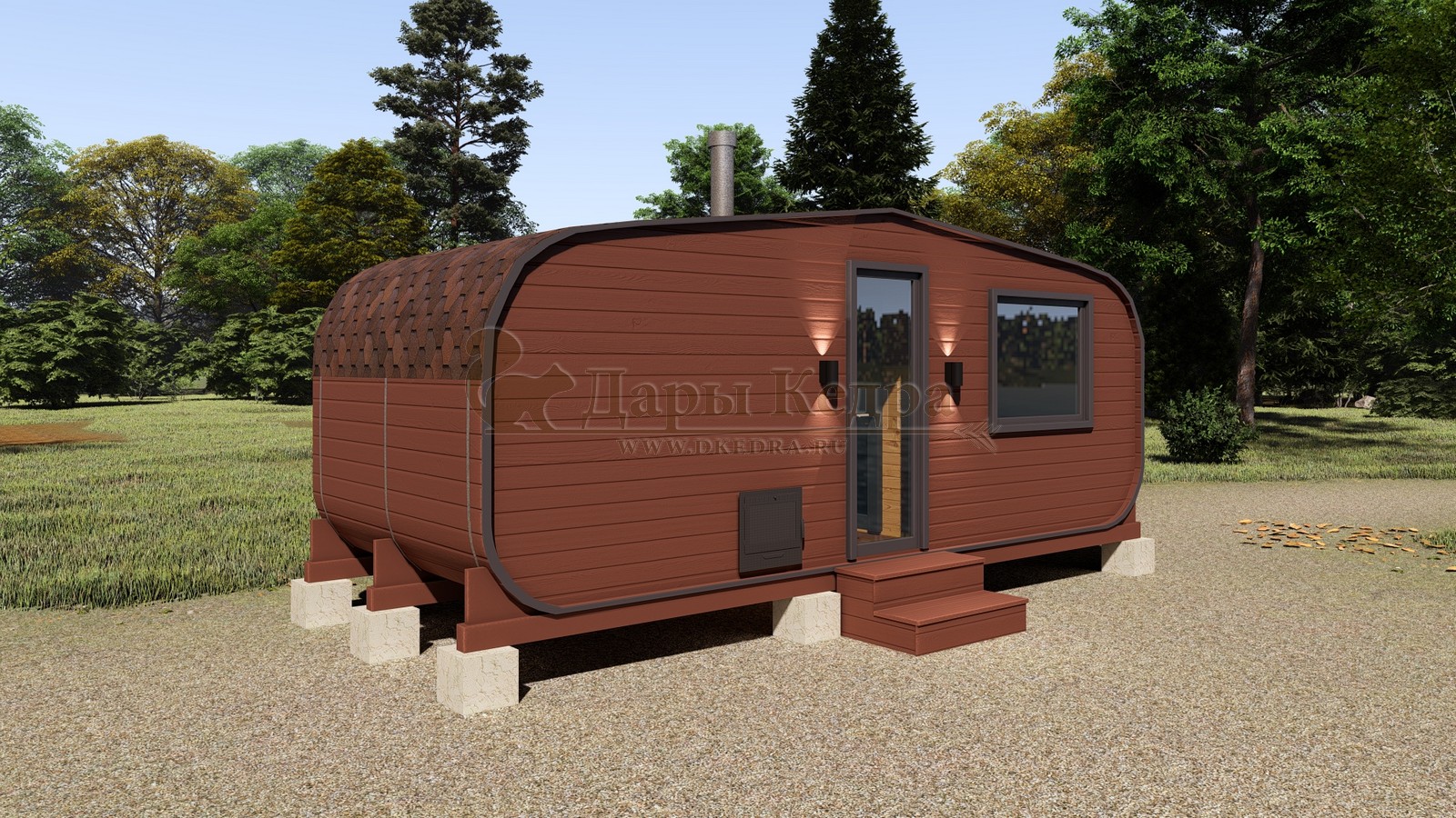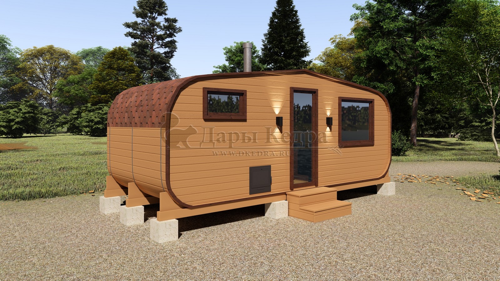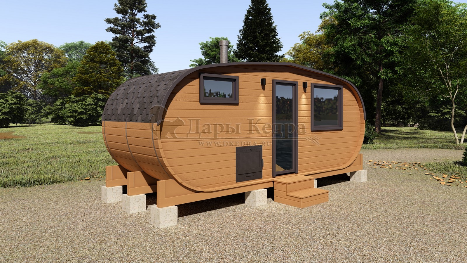 Симбиоз круглой и квадратной бани-бочки. Разработано с учётом эргономики, в ней так же просторно, как и в квадро-бочке, но при этом полукруглая крыша не дает задерживаться снегу и влаге на кровле. А еще такая баня безусловно красивая, мобильная и доступная каждому!