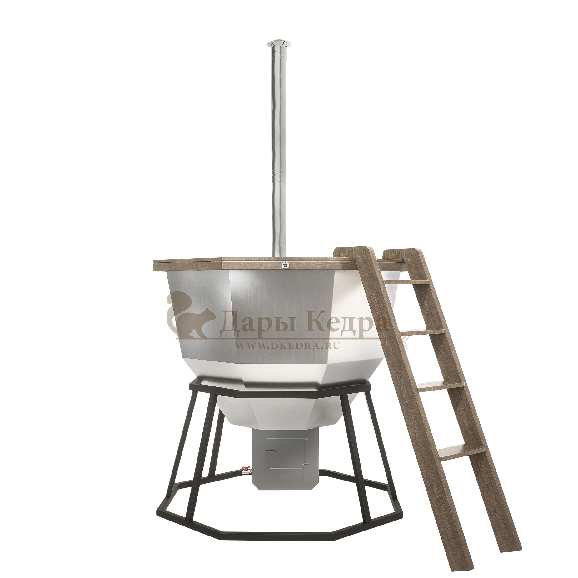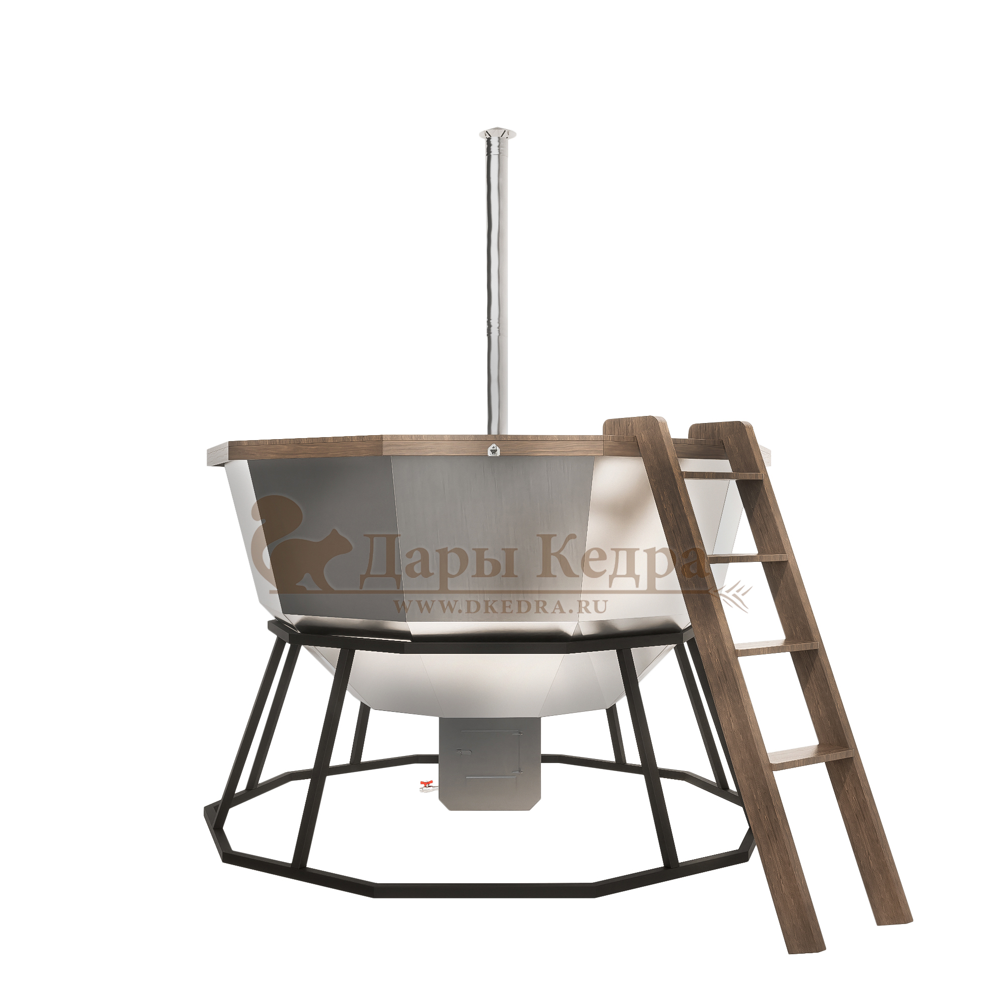 Банный чан из нержавеющей стали Ø-2000 на подставке Банный чан на подставке изготовлен из пищевой стали. Представляет собой большую ёмкость в виде чаши, при нагревании которой можно париться на свежем воздухе. Чан установлен на устойчивую металлическую подставку и оборудован кедровым бортом, скамейками, подспинниками, трапом для ног и приставной лестницей. Нагревание банного чана происходит от обычного костра. Если оборудовать данную модель печью, то банные процедуры можно принимать даже зимой.