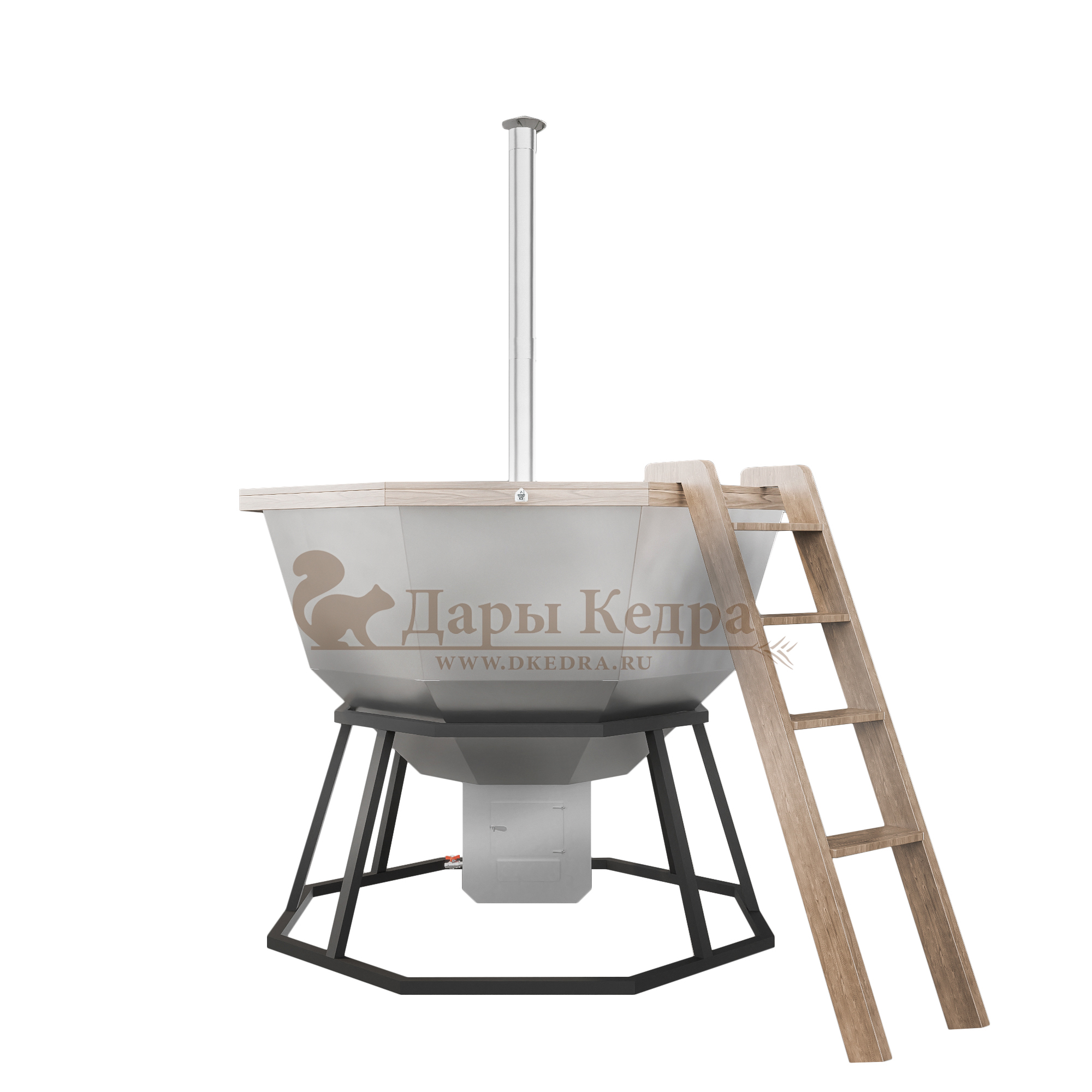 Банный чан из нержавеющей стали Ø-2350 на подставке Банный чан на подставке изготовлен из пищевой стали. Представляет собой большую ёмкость в виде чаши, при нагревании которой можно париться на свежем воздухе. Чан установлен на устойчивую металлическую подставку и оборудован кедровым бортом, скамейками, подспинниками, трапом для ног и приставной лестницей. Нагревание банного чана происходит от обычного костра. Если оборудовать данную модель печью, то банные процедуры можно принимать даже зимой.