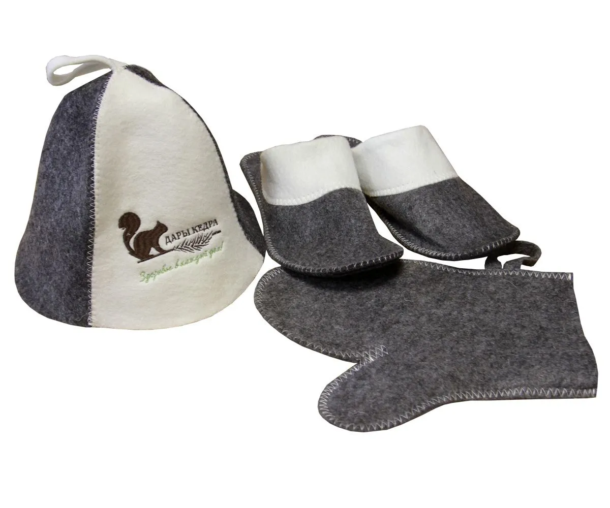 Комплект: шапка, тапочки, рукавица с фирменным логотипом будут отличным дополнением к бане, защищая от высоких температур и подчёркивая вашу индивидуальность во всём!