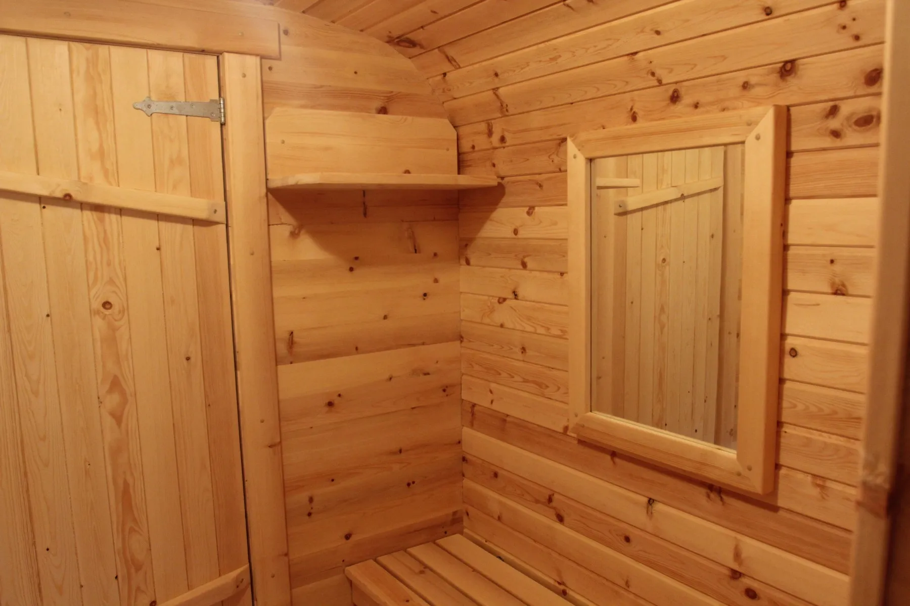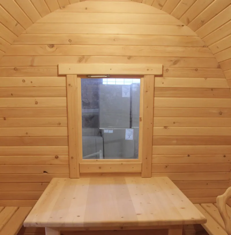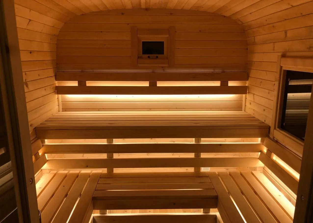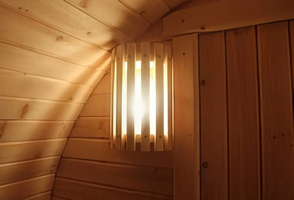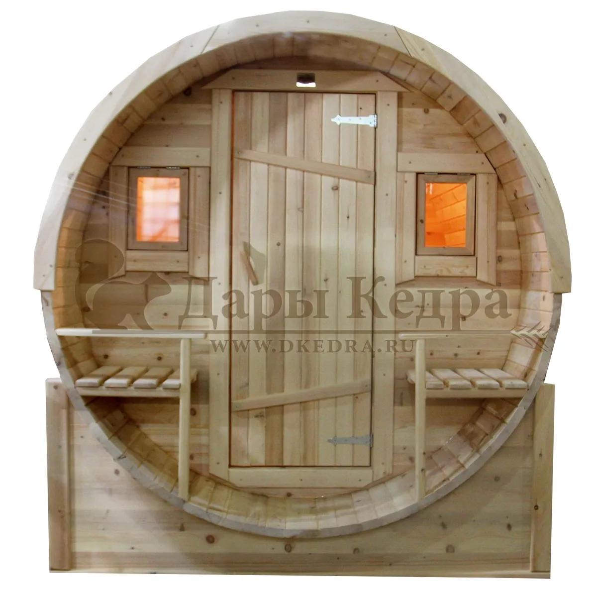 Овальная баня-бочка из кедра просторная и вместительная. Имеет два отделения: раздевалку, которую можно использовать как комнату отдыха, и парилку. Для удобства пользования раздевалка оснащена лавочкой, полкой и вешалкой из кедра. В парильном отделении располагается печь и двухуровневый открытый полок. Для установки такой модели не требуется полноценный фундамент, поэтому при необходимости ее можно перенести на другое место. Так же баню-бочку можно укомплектовать верандой со скамейками, козырьком и печью с внешней загрузкой, благодаря которой весь мусор после топки останется на улице.