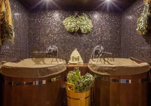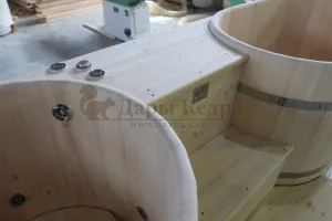 Двойная купель из кедра чаще всего используется в крупных банных комплексах и оздоровительных центрах. Она представляет собой две круглые чаши для воды, в которых люди отдыхают после парения. Между купелями установлен широкий подиум из кедра, по которому могут спускаться и подниматься сразу несколько людей. Для комфортного отдыха купель оснащена лавочками и двумя дополнительными лестницами. За счет стяжных болтов обручи из нержавеющей стали плотно прилегают к кедровой купели. Это позволяет равномерно распределять нагрузку воды и сохранить форму изделия в период эксплуатации. При правильном уходе купель для бани не рассыхается и не подвергается гниению.