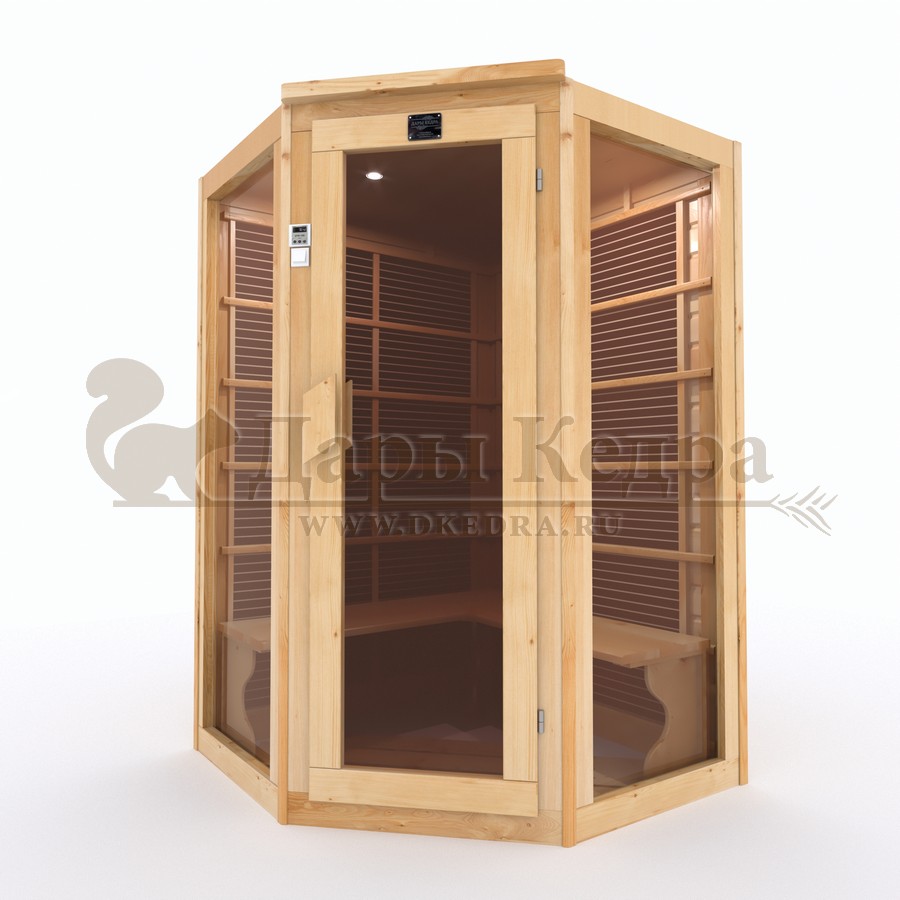 Двухместная угловая инфракрасная сауна кабина из кедра с карбоновыми излучателями Это специально оборудованная кедровая кабина для прогрева тела человека сухим теплом. Воздух в таких парных не нагревается. Инфракрасные лучи воздействуют на тело, равномерно прогревая мышцы, суставы и органы. Карбоновые излучатели, встроенные в стены кабины, обладают мягким прогревом, что полностью исключает возможность ожога. Работает кабина за счет электричества. Установка сауны в угол, позволяет рационально использовать пространство помещения. Подходит как для домашнего использования, так и для коммерции. Обращаем Ваше внимание что в стандартную комплектацию входит трапик для ног, но вы можете его заменить на цельный пол совершенно бесплатно! Целебная древесина кедра и инфракрасные лучи благотворно влияют на организм человека в целом. При регулярном использовании инфракрасной сауны укрепляется иммунитет, улучшается кровообращение и состояние кожи, выводятся токсины.