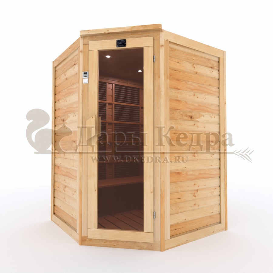 Это специально оборудованная кедровая кабина для прогрева тела человека сухим теплом. Воздух в таких парных не нагревается. Инфракрасные лучи воздействуют на тело, равномерно прогревая мышцы, суставы и органы. Карбоновые излучатели, встроенные в стены кабины, обладают мягким прогревом, что полностью исключает возможность ожога. Работает кабина за счет электричества. Установка сауны в угол, позволяет рационально использовать пространство помещения. Подходит как для домашнего использования, так и для коммерции.